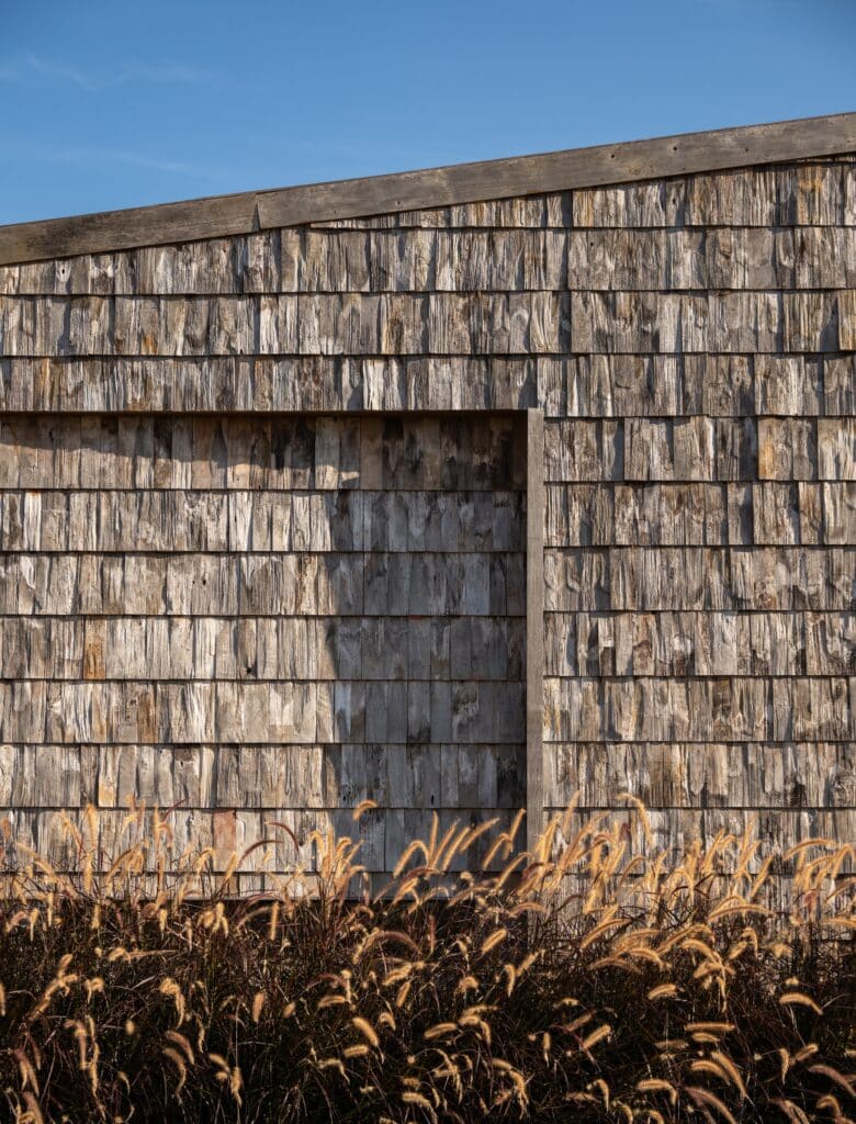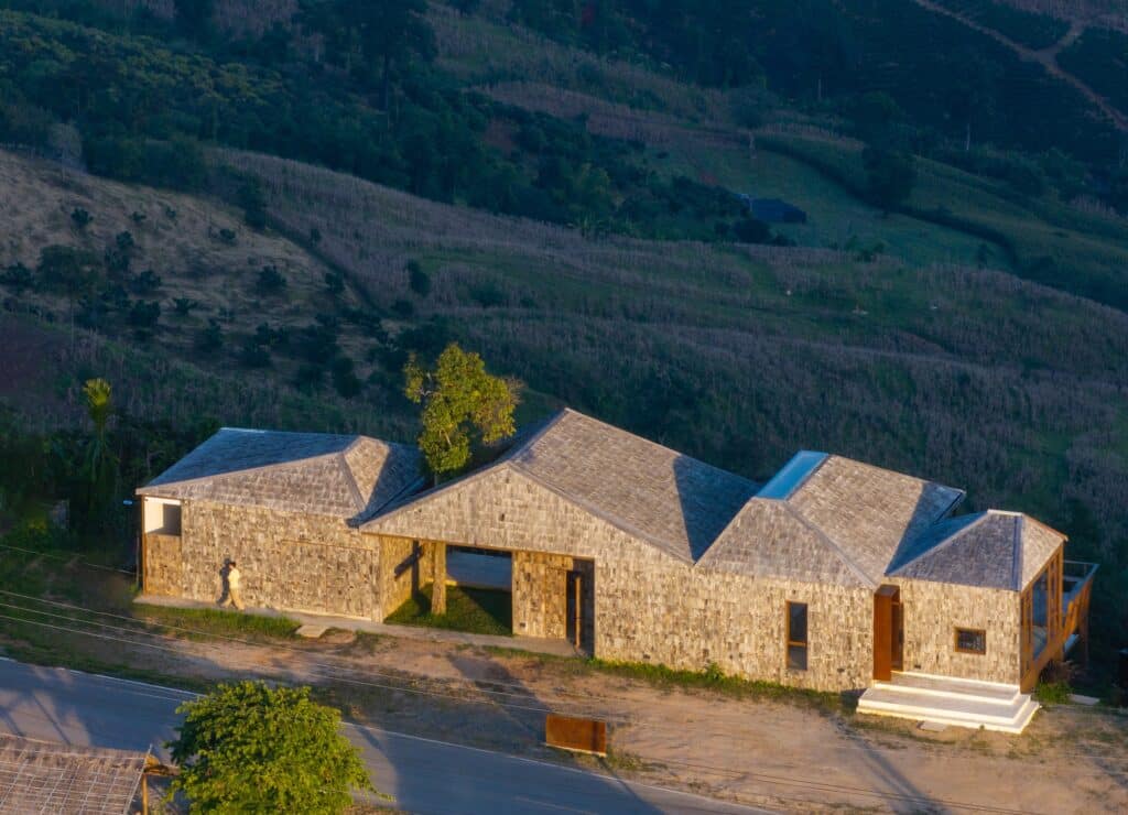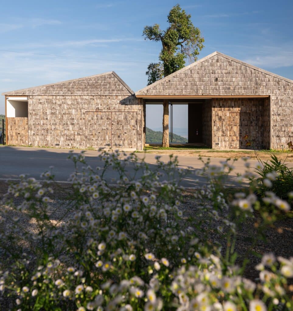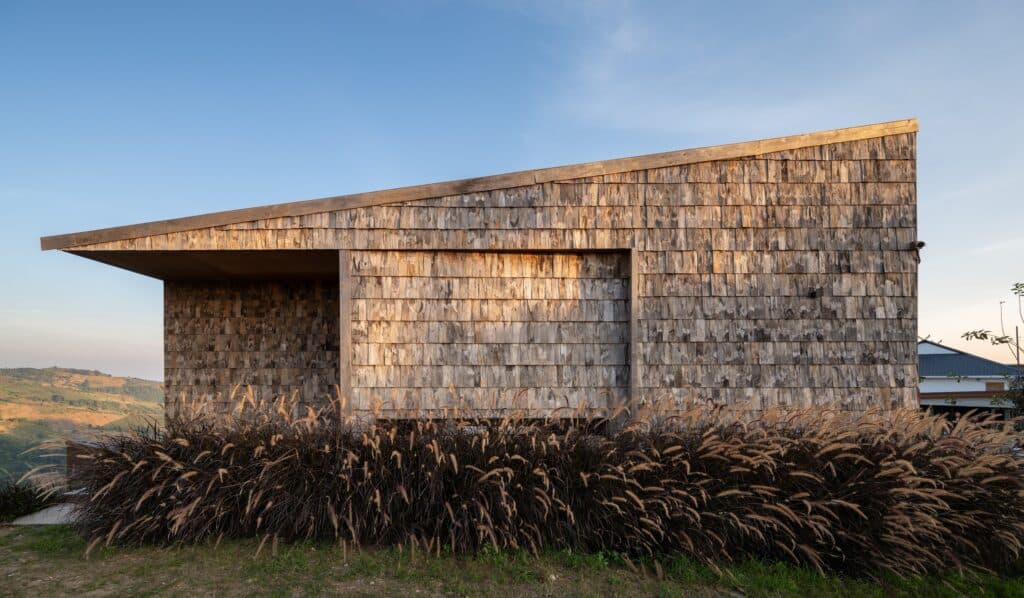 This strategy is realized through the use of reuse and upcycling practices. Reclaimed wooden roof shingles sourced from dismantled local vernacular houses, along with surplus timber from the wood-processing industry, are reintegrated into the architectural design. The project benefits from the collaboration and material expertise of Champaca Wood, whose knowledge of reclaimed and leftover timber informed both design and construction processes.