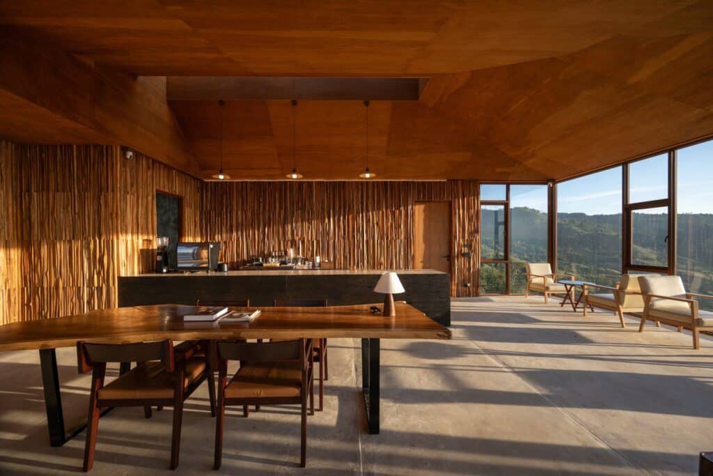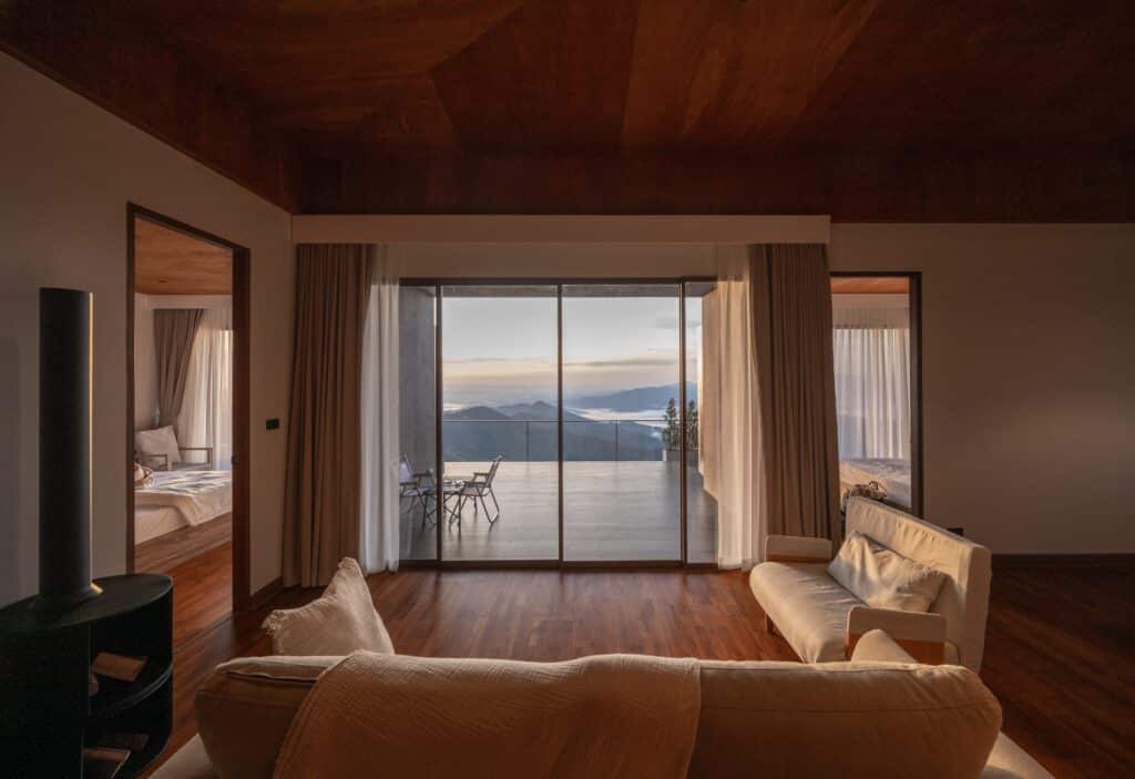 This conceptual continuity extends beyond the exterior and is carried into the interior spaces. Slanted lines and geometries derived from the external form are translated into interior elements, particularly through ceiling design. These gestures establish a sense of spatial continuity between outside and inside, allowing boundaries to dissolve and creating a fluid architectural experience that feels intuitive and natural.