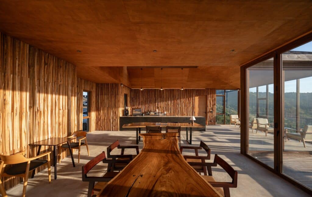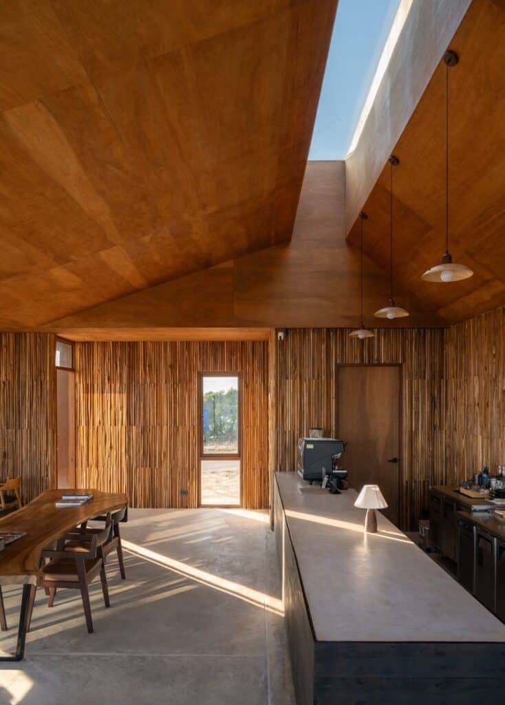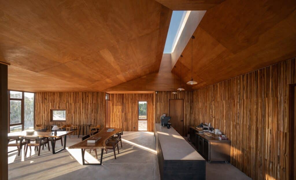ขณะเดียวกัน กระพี้ไม้ซึ่งเป็นเศษเหลือจากการตัดไม้แผ่น ถูกนำมาใช้กับผนังภายใน เพื่อสร้างมิติของพื้นผิวและเงาเมื่อแสงตกกระทบ เส้นเฉียง เส้นโค้ง และลักษณะตามธรรมชาติของเนื้อไม้ถูกขับเน้นอย่างตั้งใจ เกิดบรรยากาศแบบ Rustic ที่สะท้อนความเป็นท้องถิ่น (Local Identity) อย่างชัดเจน