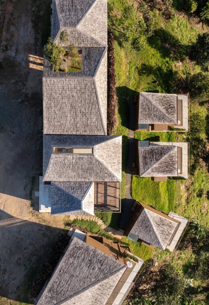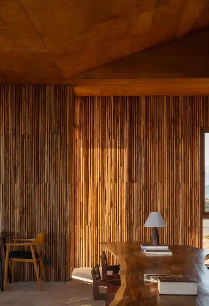 Reclaimed teak roof shingles are repurposed as the building skin, replacing newly processed timber and reducing material waste. Sapwood offcuts—typically discarded during timber cutting—are used as interior wall finishes, creating depth, texture, and nuanced shadow play as light moves across the surfaces. The natural curves, imperfections, and grain patterns of the wood are intentionally revealed, contributing to a restrained rustic character that reflects a strong sense of local identity.